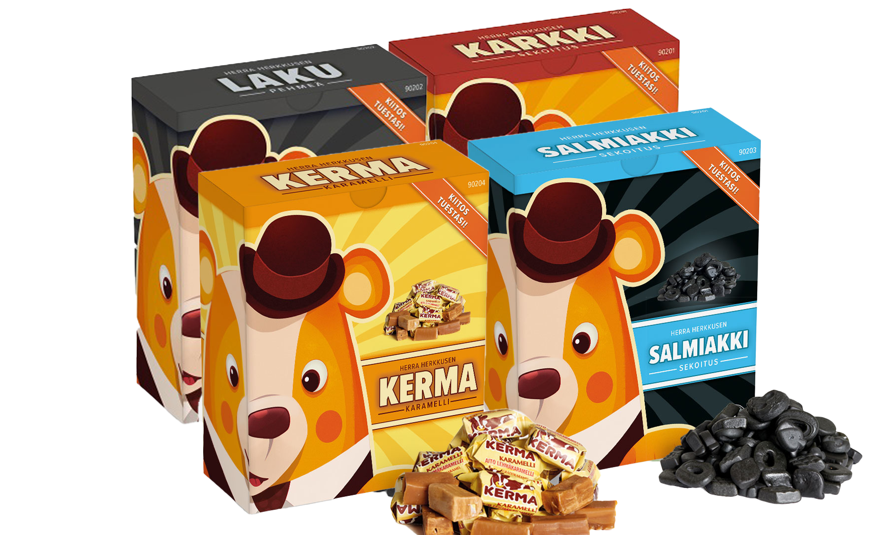 Herra Herkkusen valikoimassa on makeisia jokaiseen makuun. Lakuja, salmiakkia, kermakaramelleja, irtokarkkeja – valitse suosikkisi!