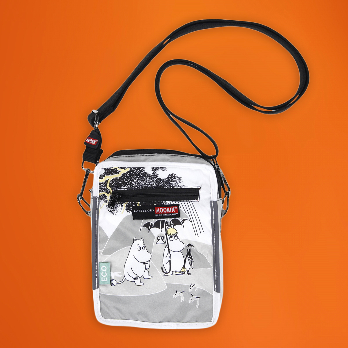 Pieni, mutta yllättävän tilava pussukka sisältää kaksi vetoketjullista osastoa: päältä avattava koko pussukan kattava säilytystila isommille tavaroille ja pienempi sivutasku, jonka saa näppärästi suljettua vetoketjulla. Säädettävä olkahihna.